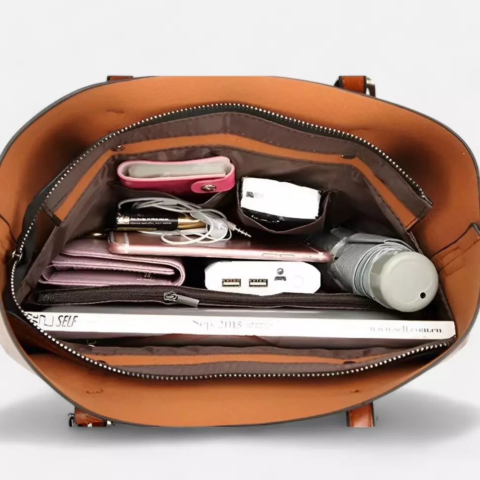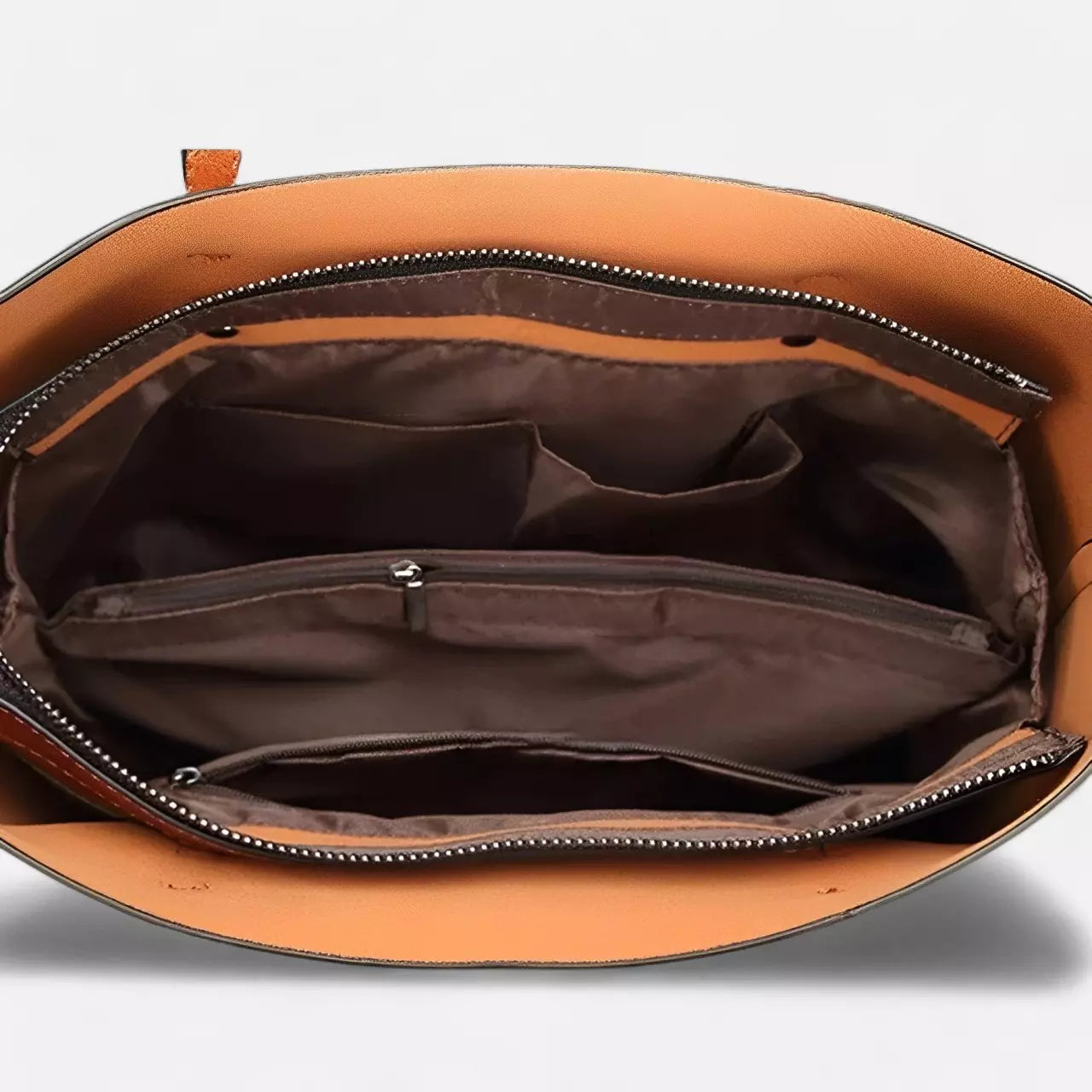 - 6 compartimentos internos, sendo eles: 2 pequenos, 1 médio, 2 grandes e 1 bolso com fechamento de zíper no centro da bolsa;