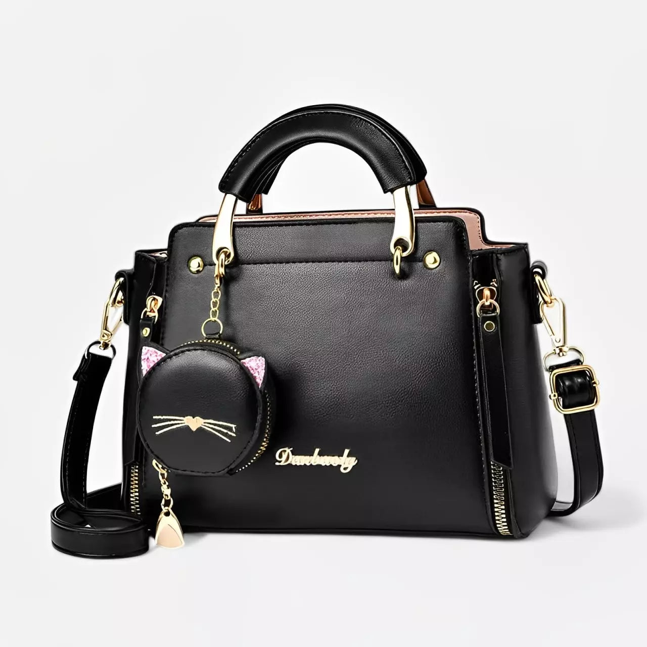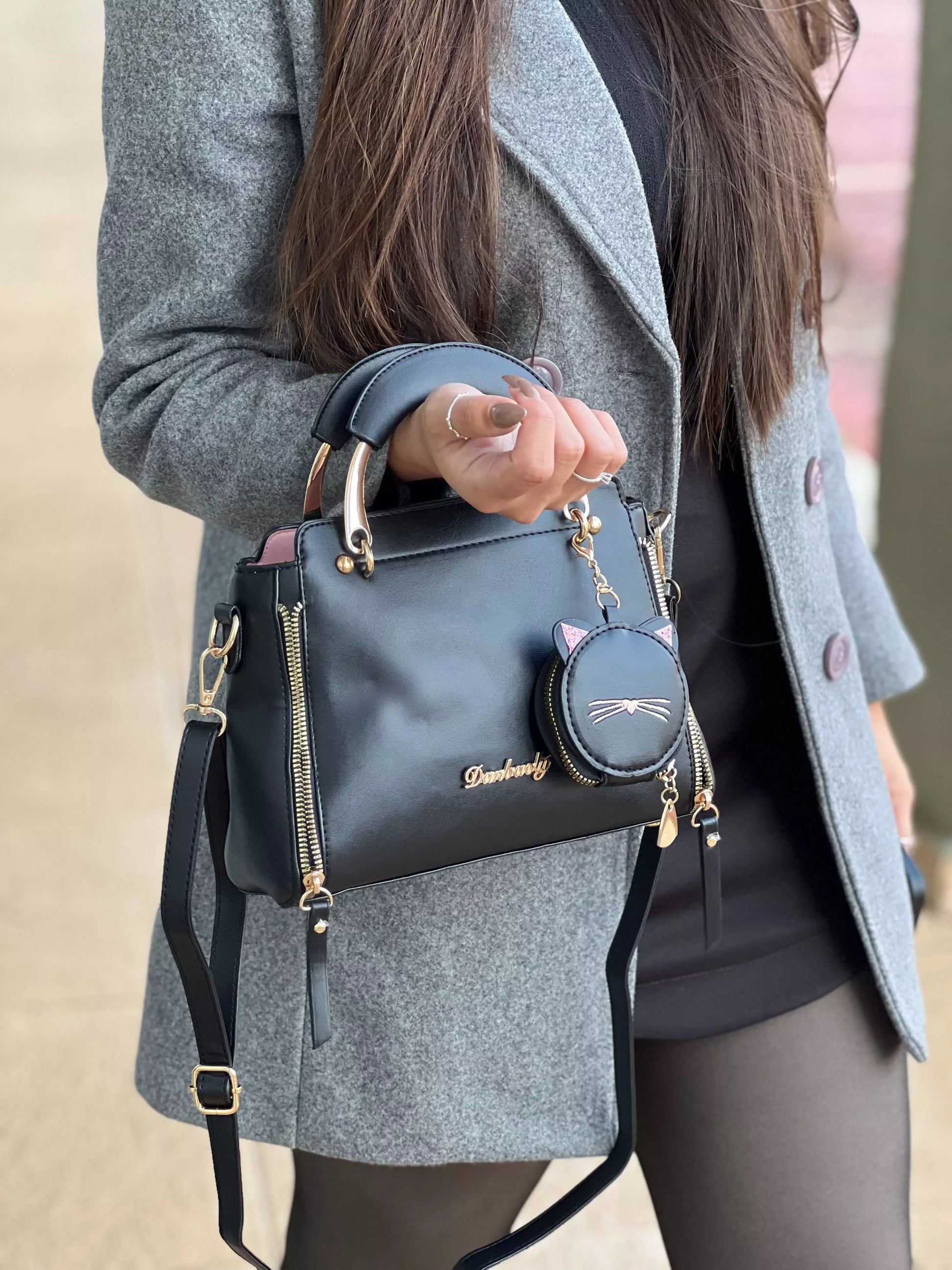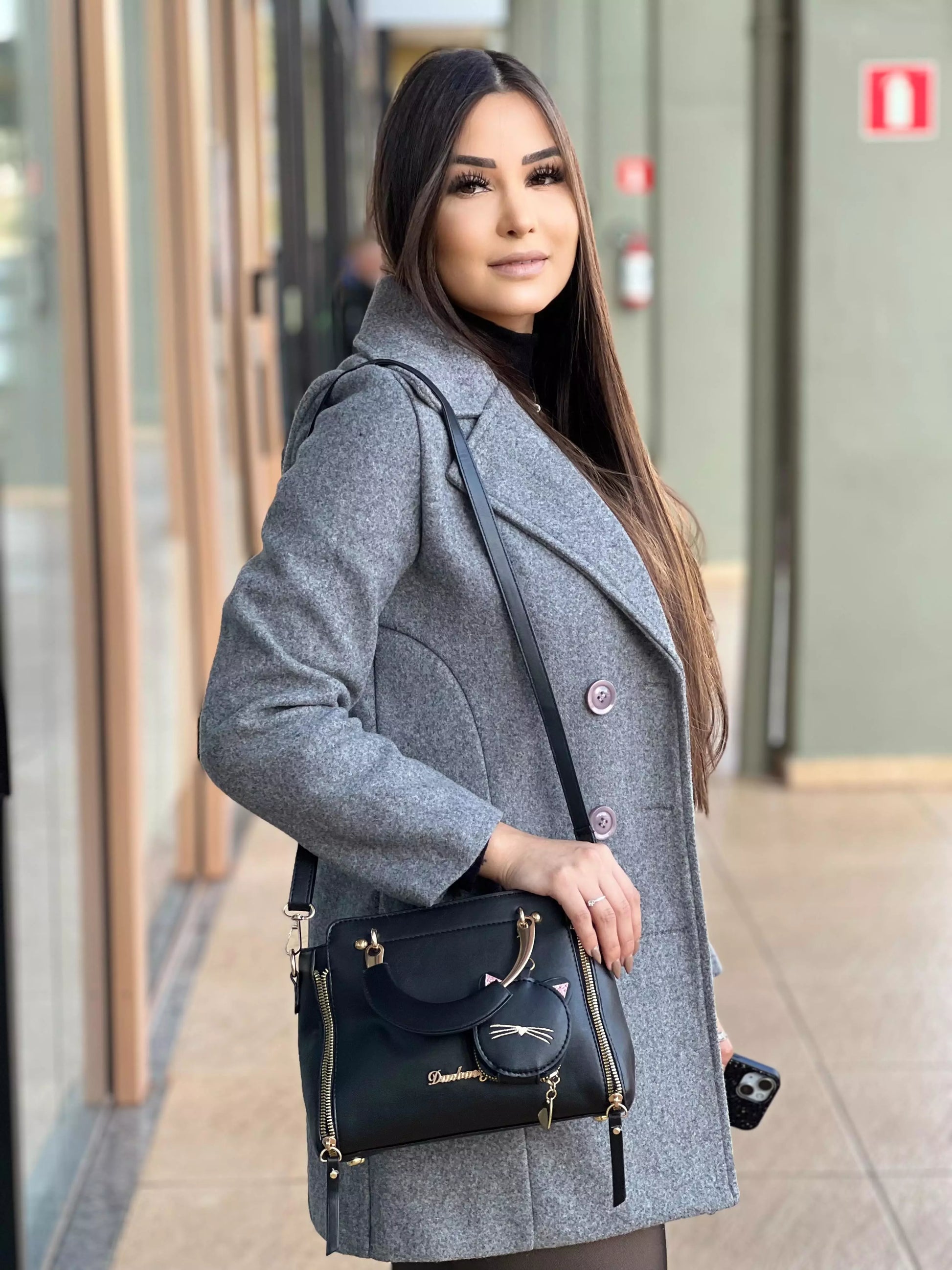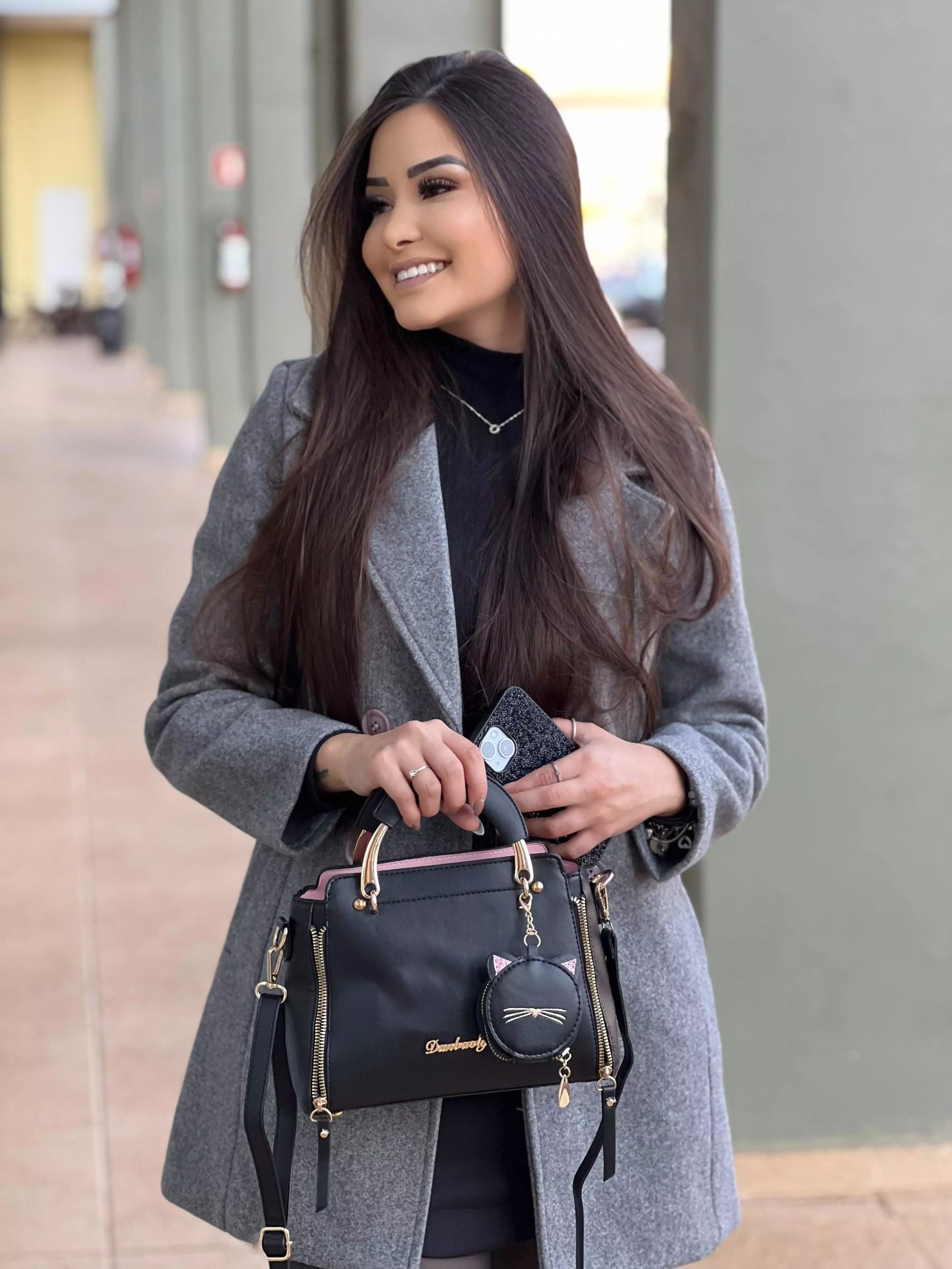 - Acompanha a bolsa um pequeno bolso redondo com um chame de um gato, feito para colocar moedas, fone de ouvido, etc.