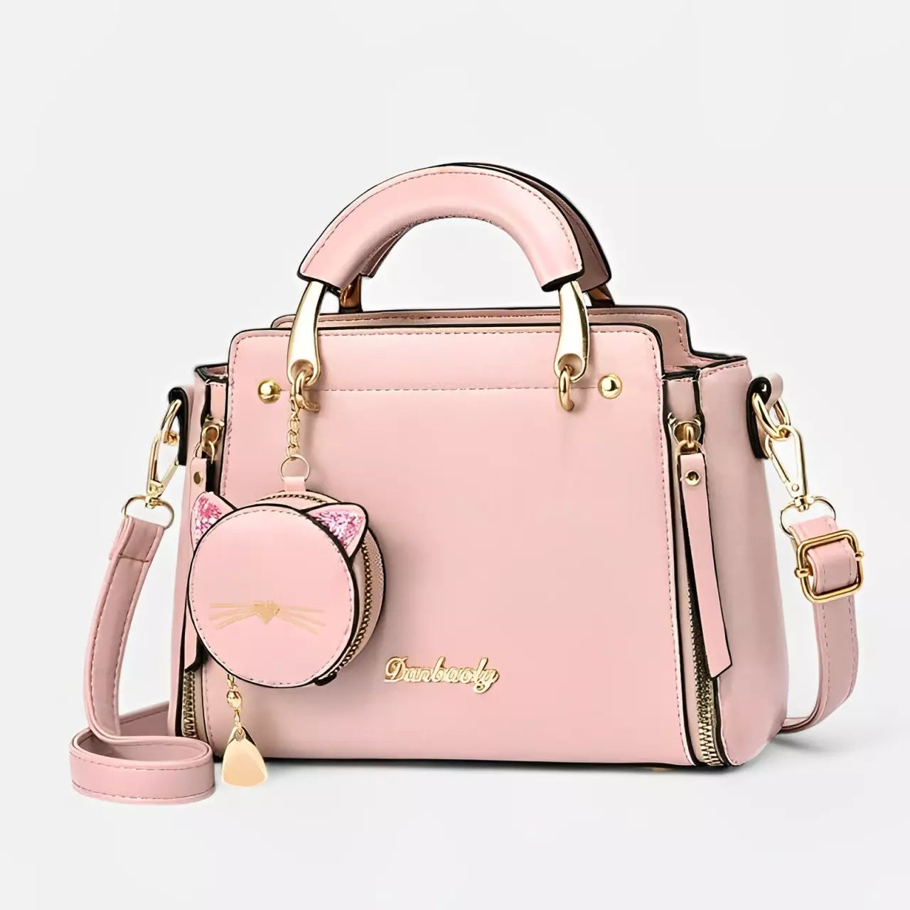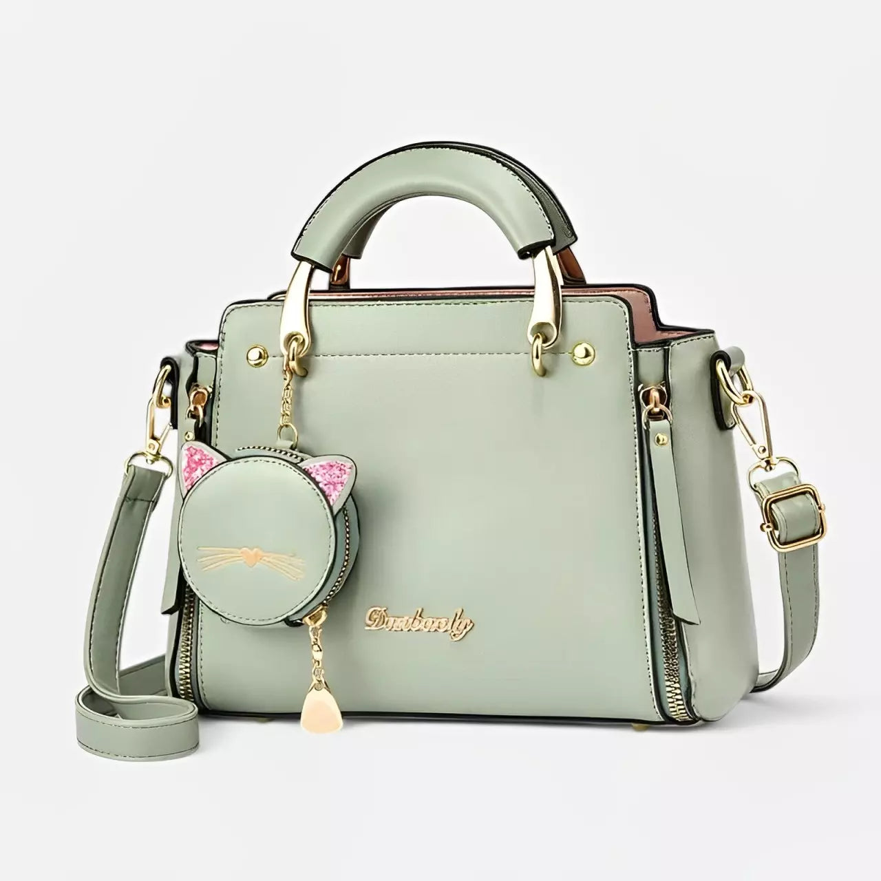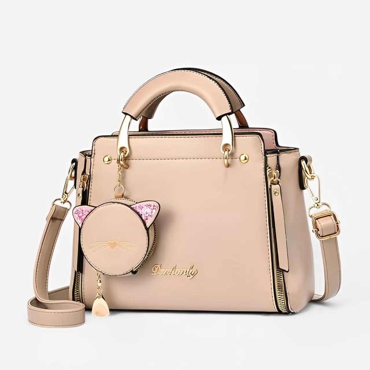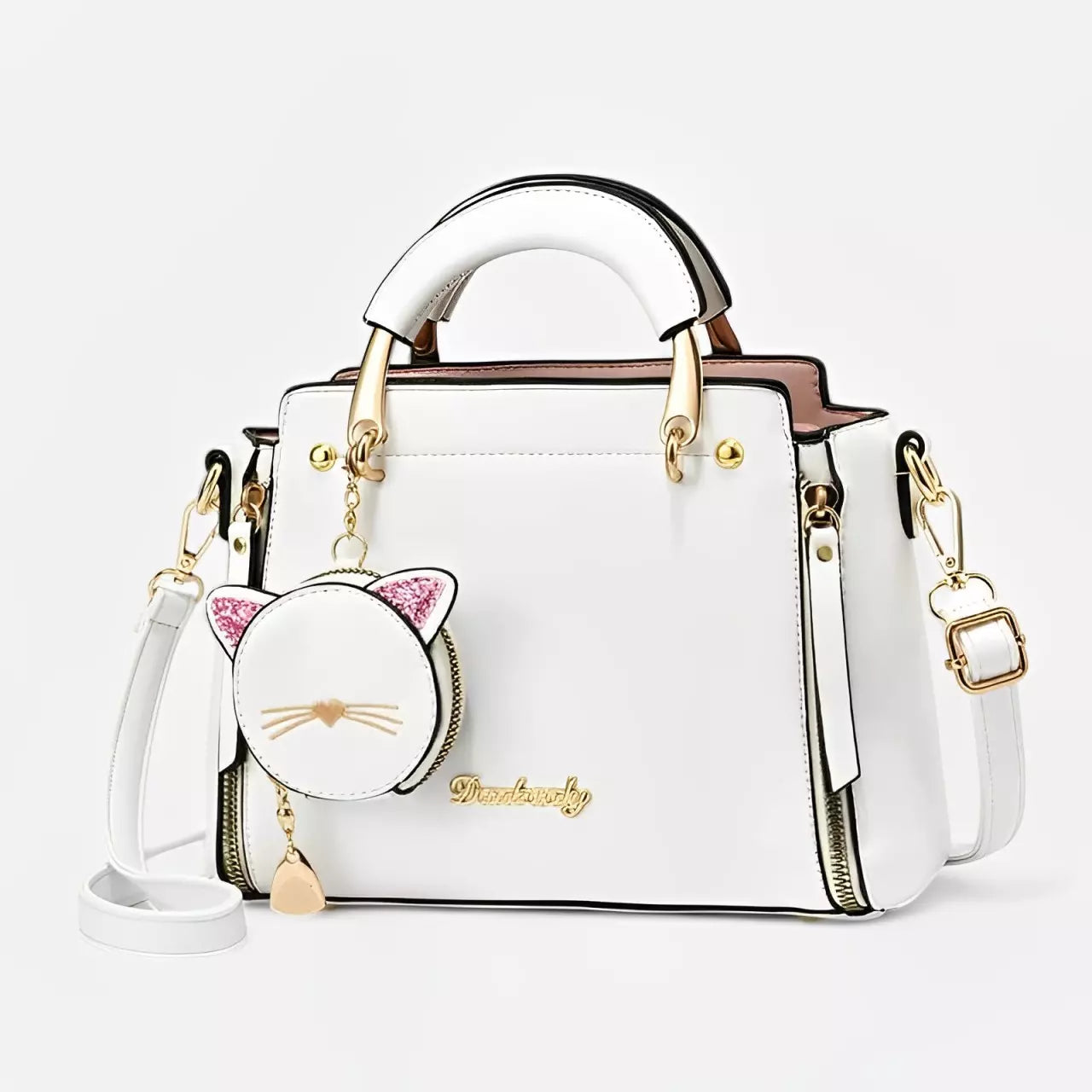 - Acompanha a bolsa um pequeno bolso redondo com um chame de um gato, feito para colocar moedas, fone de ouvido, etc.